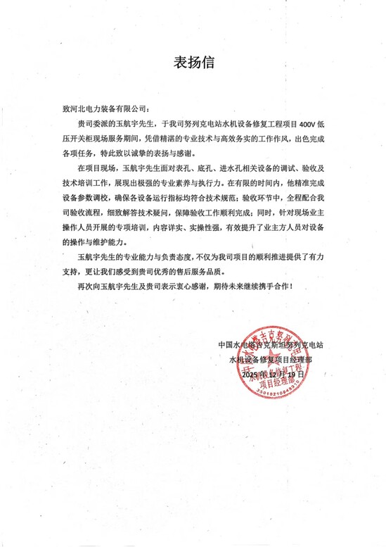 近日,中国水电塔吉克斯坦努列克电站项目部发来表扬信,对河北装备公司的海外售后服务给予高度认可,并表达了维持良好合作关系的愿望。 |