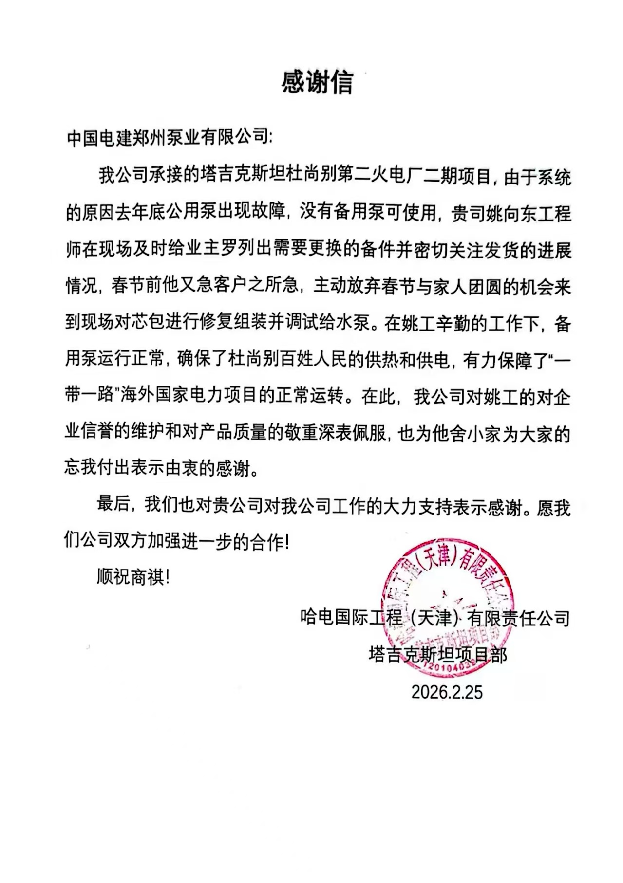 马年伊始,春启新程。郑州泵业公司成功中标哈电国际总承包的塔吉克斯坦杜尚别-2号火电站二期2×150MW机组扩建工程锅炉给水泵项目。此次中标为公司“十五五”开局之年斩获海外市场“开门红”,充分彰显公司在能源电力装备领域的核心竞争优势。 塔吉克斯坦杜尚别-2号火电站一期50MW机组、二期150MW机组的锅炉给水泵均由公司独家供货,业主及总包方的持续认可,是公司全体同仁坚守品质、深耕服务的成果。一期项目中,给水泵突发运行故障,公司迅速研判部署,派遣资深售后工程师赴现场检修,圆满完成设备修复,保障电厂平稳运转,赢得多方好评,也为二期合作筑牢基础。 开局即决战,起步即冲刺。郑州泵业公司将以此次中标为契机,乘势而上、锐意进取,以饱满的工作热情和昂扬的奋斗姿态,全力推进“十五五”开局之年各项工作顺利开展,奋力冲刺全年目标任务。未来,公司将持续深耕海外市场,拓展市场空间、提升核心竞争力,围绕“电建装备、装备电建、服务全球”发展新格局,以优质的产品与服务推动公司高质量发展再上新台阶、再获新突破。 |